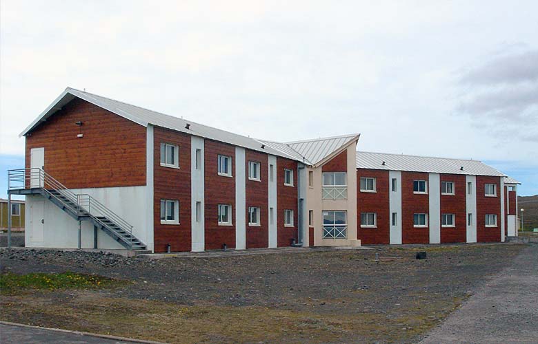 La Résidence, in two sections, houses the District Chief (left) and personnel from CNES/Météo-France (right). (click on image to view gallery) Non-military personnel are generally grouped together in each 'L' unit according to their fields of scientific research (eco-biology, geophysics, ornithology, etc.) or their occupational / technical specialties (HVAC, infrastructure, kitchen staff, mechanical, etc.). Such groupings aid in socialization between the workers, who will also tend to gravitate toward one another when dining at TiKer. District Chief's ResidenceCoordinates: 49°20'56.13"S, 70°13'11.64"E or decimal: -49.348631, 70.216478. Situated on the northwestern edge of the PAF community, La Résidence consists of two sections which were constructed in separate stages. The west wing contains the apartments of the island's district chief (taafien: DisKer) and a small reception hall which is sometimes used for official or ceremonial functions – such as visits from TAAF administrators, French government dignitaries and military officers. A later addition, the east wing currently houses personnel from CNES and Météo-France. Related videosFirst video: Kerguelen Islands. Bernard Aarts, President of INCA Arts (International Network of Commercial and Citizens Associations), presents this introductory slideshow which showcases the base at Port-aux-Français, assorted flora & fauna, and some of the majestic scenery on Kerguelen. (1:49) Editing, translation, and portions written by Ian C. Mills © 2000- – All Rights Reserved. For sources of information, recommended publications, photo and video credits, please refer to the Bibliography.