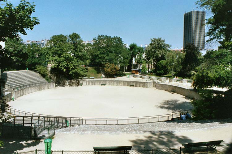 Arènes de Lutèce, viewed from upper bleachers. (Jussieu campus tower in background) ©2003 Ian C. Mills, Discover France The city of Paris is so layered with history, it's easy to forget that beyond the Renaissance palaces and Gothic cathedrals there lie traces of the city's Roman heritage. Named Lutèce, after the Latin Lutetia, Gallo-Roman Paris was a prosperous town stretching from the Ile de la Cité to the Left Bank. Paris' 5th arrondissement, covering what was once the "new town", is home to the only remaining vestiges of the Gallo-Roman era in Paris. These include the remains of the thermal baths at Musée de Cluny, and the Arènes de Lutèce. The Arènes are particularly pleasant to visit during spring and summer, when the amphitheater is taken over by students enjoying an outdoor lunch, children playing soccer, or men engaged in the venerable game of pétanque (boules). Built toward the end of the first century A.D. on the slopes of the Montagne Sainte-Geneviève outside Lutèce, the Arènes were used as a theater, circus, and sporting arena. The style of construction is relatively rare for an amphitheater of its period, different from the round or classical oval (Latin: cavea) style.