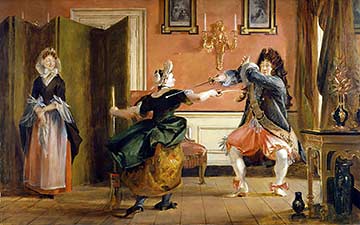 In demonstrating his new fencing 'skills' to his maidservant Nicole, M. Jourdain is embarrassed to be struck several times by her foil. His wife looks on in amusement. (click on image to enlarge) MONSIEUR JOURDAIN: Goodness! I have been speaking prose for over forty years without being aware of it, and I am much obliged to you for having taught me that.(10a) Meanwhile, M. Jourdain's daughter Lucile is in love with Cléonte, a respectable and honest young man, whom she hopes to marry. Her father interviews Cléonte and asks him if he's a gentleman. Aware that it would be dishonest to claim such social status, Cléonte admits he is not. When M. Jourdain insists that his daughter must only marry into a noble family, his wife protests: MADAME JOURDAIN: As for me, it's something to which I'll never agree. Marriages above one's station always run into problems. I have absolutely no wish for a son-in-law who will quarrel with my daughter because of her parents' station in life, and I don't want her to have children who will be ashamed to call me their grandmother.(10b)
